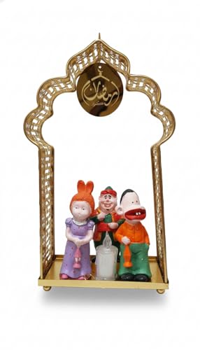 Generic - استاند معدن خمات عاليه الجوده بلون دهبى على شكل رمضانى بداخله مجسمات شخصيات ديكور للمنزل والمكت رمضانيه حامل رسمه فانوس ودلايه رمضان اكريلك