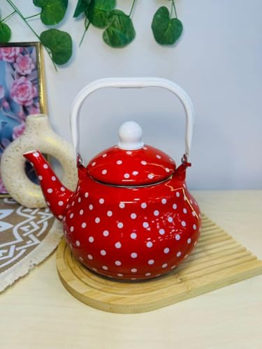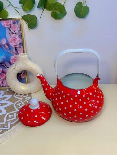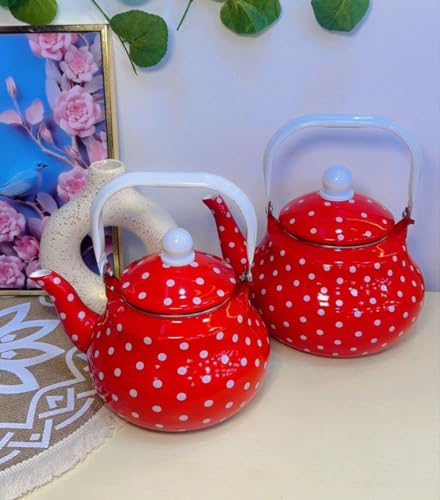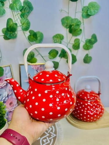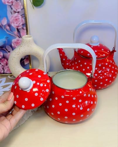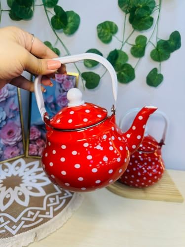 - براد شاي صاج احمر منقط ابيض شيك جدا للتقديم علي السفره له يد بلاستيك للاستخدام المريح وعزل الحراره