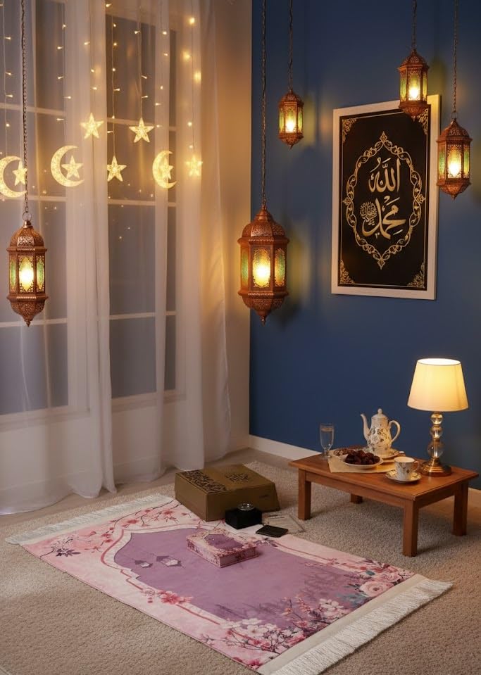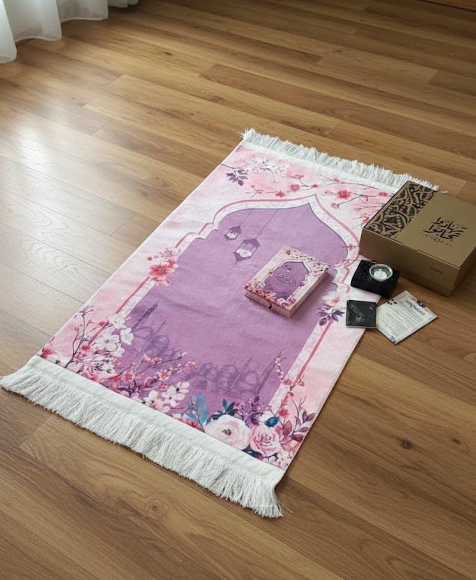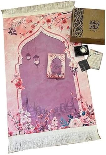 Generic - سجادة صلاة مصنوعة من القطن المخلوط باللون الوردي، بتصميم منسوج مسطح ذات جودة عالية. تأتي مع مصحف وسبحة وأذكار ومبخرة