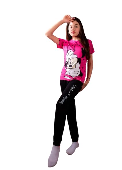 بيجامه بناتي تيشرت فوشيا ورسمي ميكي وبنطلون اسود