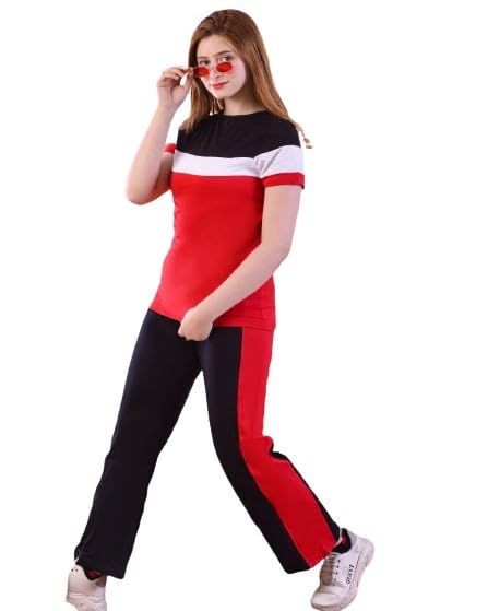 Generic - بيجامه بناتي من قطعتيين تيشرت احمر مخطط ابيض في اسود وبنطلون اسود بشريط من الجوانب احمر
