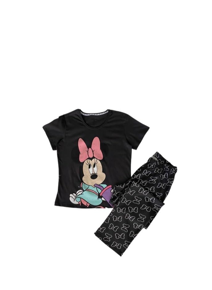 Generic - بيجامه حريمي من قطعتيين تيشرت نص كوم اسود به رسمه وبنطلون اسود به رسمه