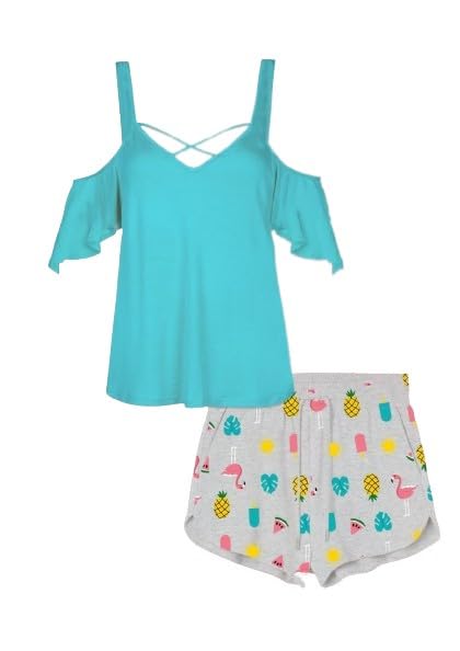 Generic - بيجامه حريمي من قطعتيين تيشرت تركواز وشورت رصاصي به رسمه