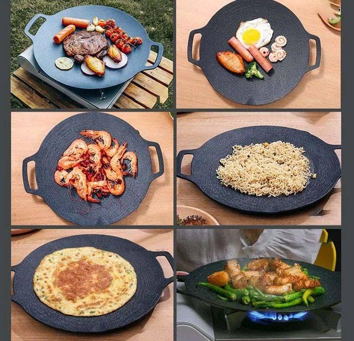 - جريل مسطح لتذوق طعم مشويات المتخصصين في المنزل بمنتهى السهولة وبنفس المذاق الرائع و لعمل البيتزا والكريب مناسبة تماماً لشوي الأسماك / الجمبري والفراخ والشيش طاووك والبرجر والستيك والكفتة وكل اصنافك المفضلة الخامه زهر مطلي جرانيت يتم وضعها على النار مباشرة يد الجريل عازلة للحرارة سهل الاستخدام والتنظيف مقاس 32 سم