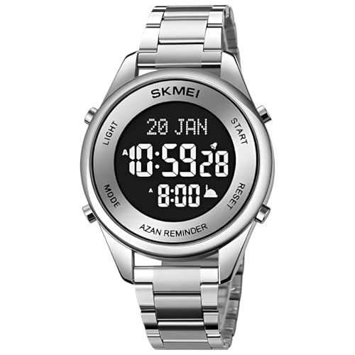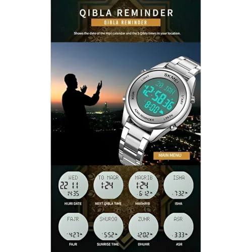 Generic - ساعة مواقيت الصلاة ستانلس ستيل فاخره للرجال بلون فضي مقاومه للماء تقويم هجري لغه عربيه اتجاه القبله ساعات الحرمين رجالي ضد الماء