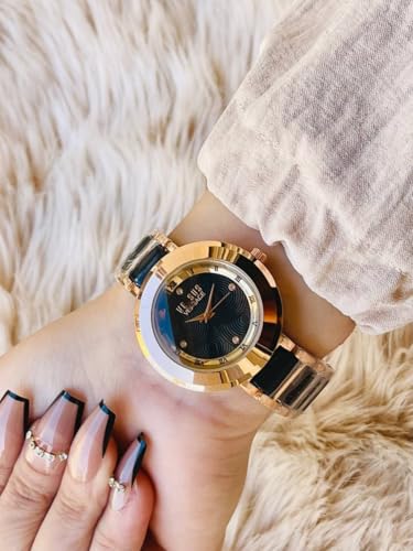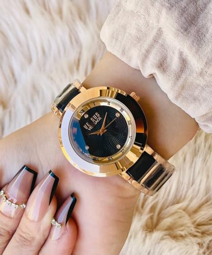 Generic - ساعة يد حريمي فخمة ذهبى و اسود، سوار ستانلس ستيل وسيراميك، أرقام رومانية، تصميم كلاسيك شيك، ساعة نسائي موضة سواريه وخروجات، اكسسوارات حريمي أنيقة، هدية عيد ميلاد أو خطوبة