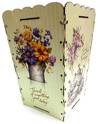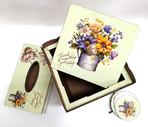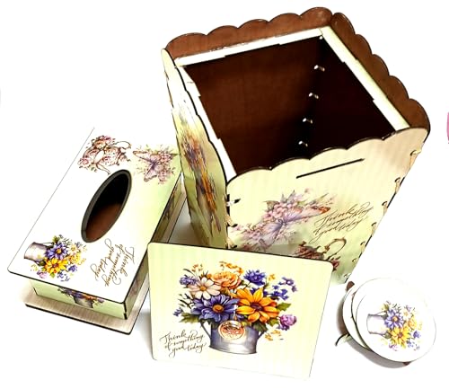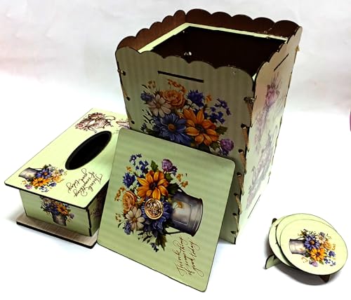 Generic - سلة قمامة وعلبة مناديل و اربعة كوسترات لون زيتي كافيه طقم مصنوع من الخشب طقم ديكور منزلي ومكتبي مطبوع عليها فازات ورد