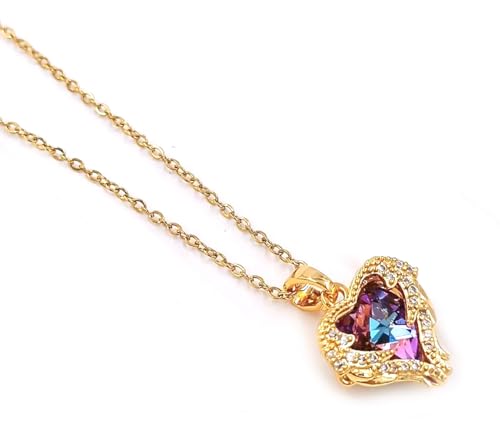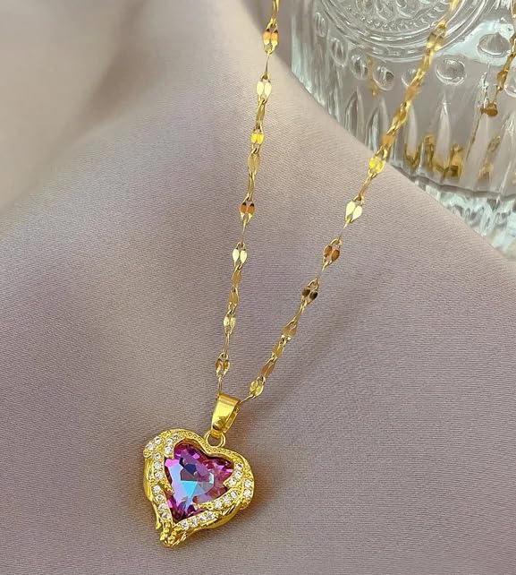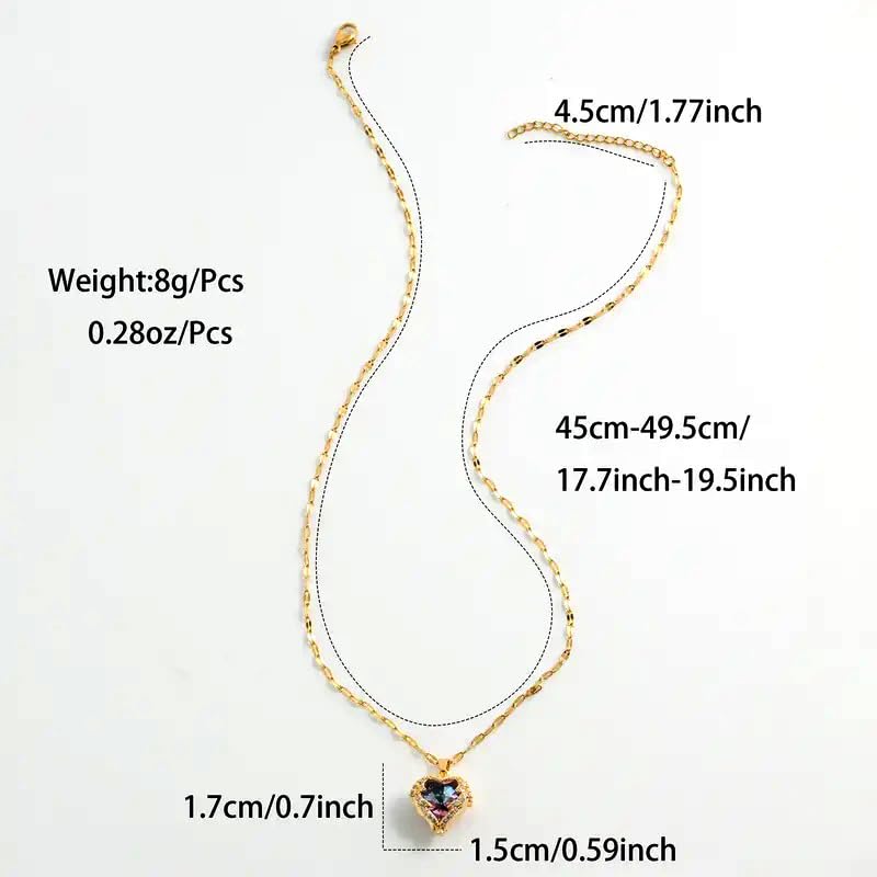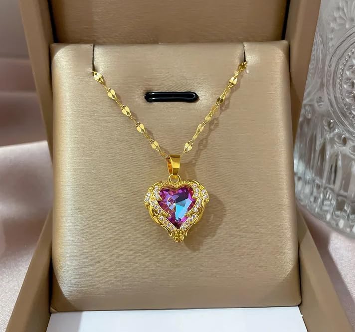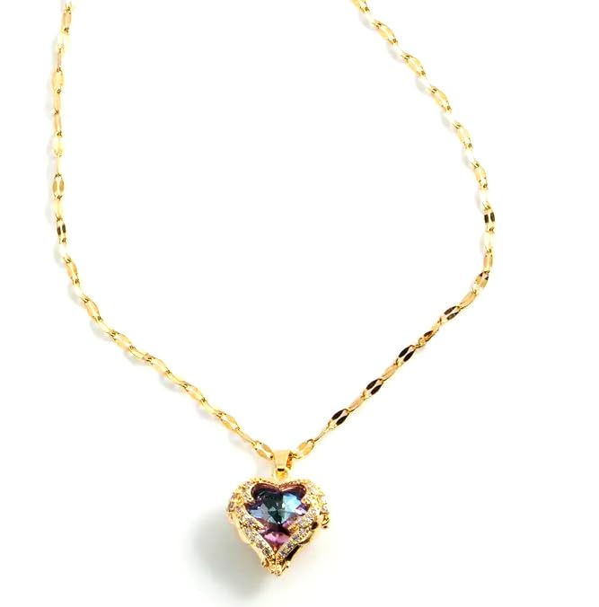 Generic - سلسلة , قلادة من ستانلس ستيل شكل قلب مرسعه كرستلات صغيره مع حجر متعدد اللون , لون ثابت لا يتغير مع مرور الوقت، للنساء