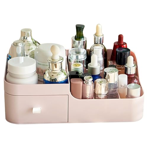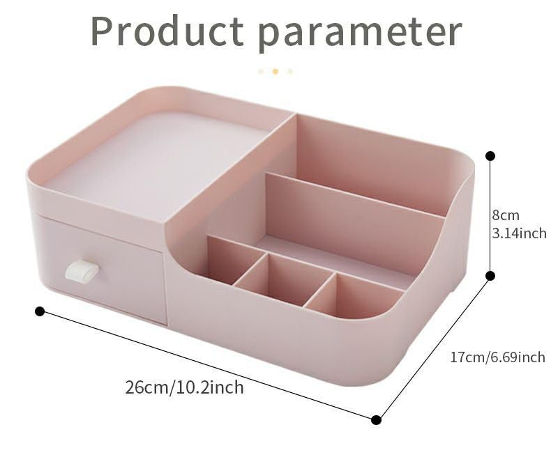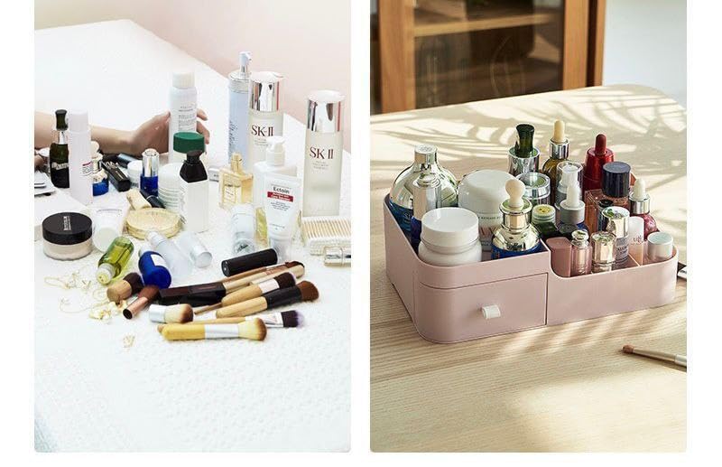 - منظم مكياج مع درج صغير و6 أقسام تخزين، يمكن أن يحمل أدوات المكياج مثل اللوشن وطلاء الأظافر والمنظف والفرش وأحمر الشفاه وأكثر من ذلك، منظم بشكل جيد.