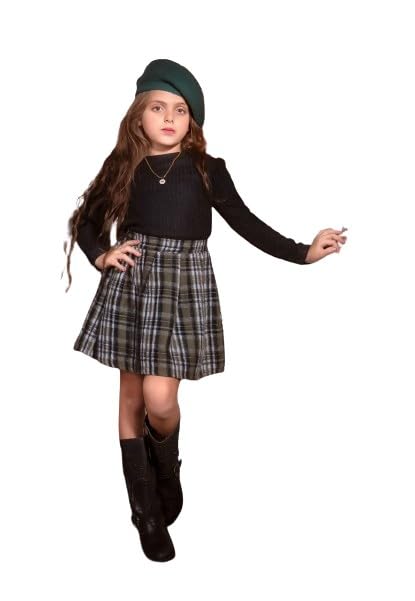 Generic - طقم بناتي خروج قطعتين تيشرت صوف اسود وجيب كارو صوف