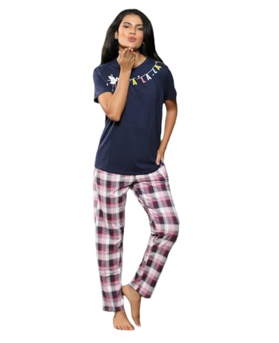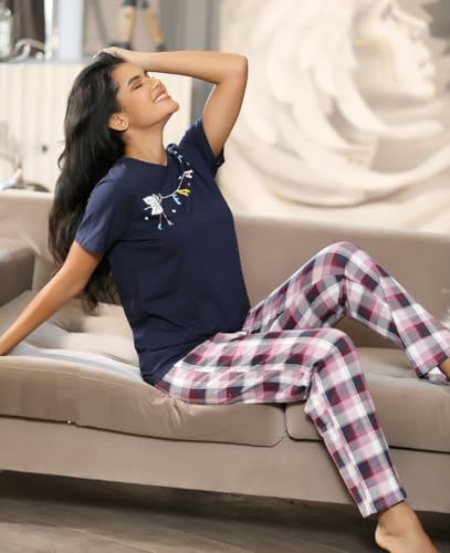 Generic - طقم بيجاما بنطلون صيفى كاروهات وتوب قطن نص كم