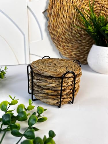 - صناعة يدوية خالصة تضمن تفرد كل قطعة بجودة حرفية استثنائية: تم نسج هذا الطقم بالكامل يدوياً من ألياف الخوص الطبيعية، مما يعني أن كل كوستر فريد من نوعه ويحمل بصمة الحرفي. هذه الصناعة اليدوية تضمن متانة فائقة وعقداً قوياً يمنع تفكك النسيج مع مرور الوقت.