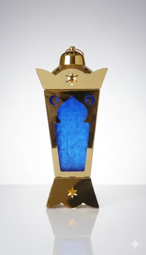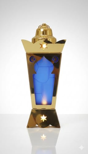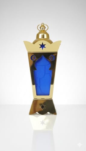 Generic - فانوس رمضان زجاجي معدني مقاس كبير خمات عاليه الجوده ، بتصميم اسلامي ذهبي وحله شيل دهبى وقبه - تصميم فريد من نوعه للديكورزجاج ازرق ومعاه وحده اضائه