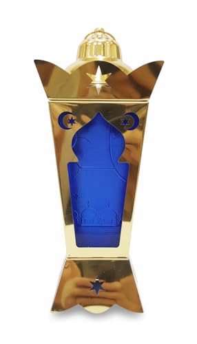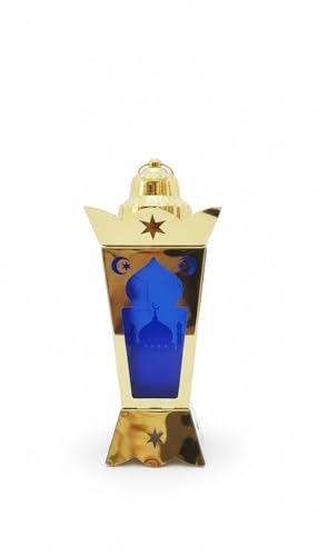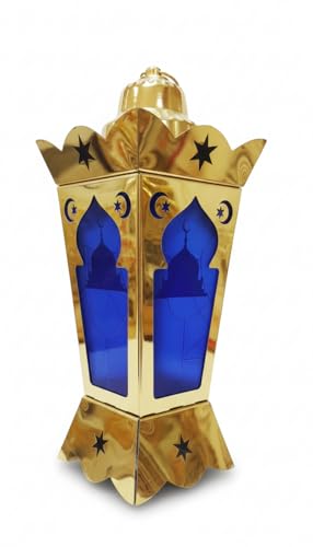 Generic - فانوس رمضان زجاجي معدني مقاس كبير خمات عاليه الجوده ، بتصميم اسلامي وحله شيل دهبى وقبه - تصميم فريد من نوعه للديكورزجاج ازرق ومعاه وحده اضائه بلون دهبى