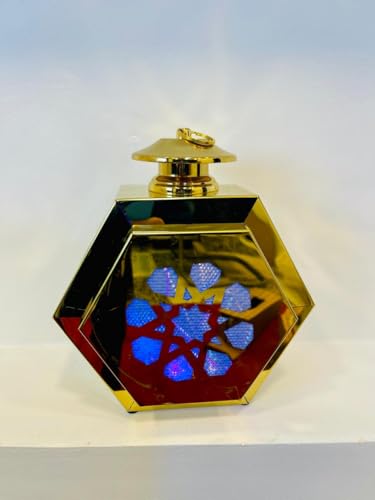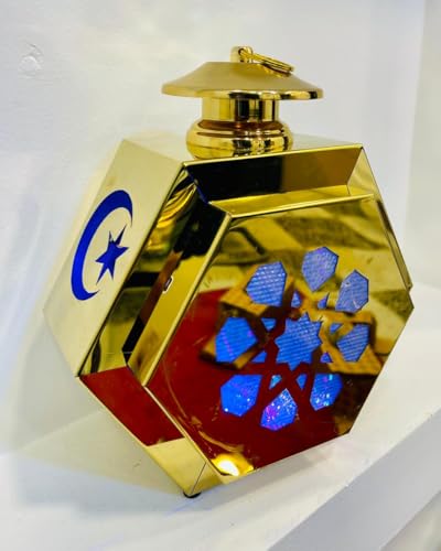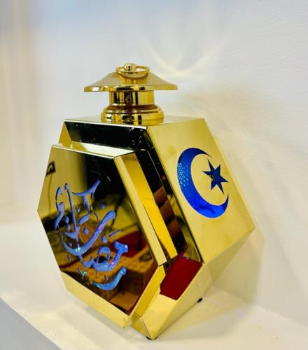 LC - فانوس رمضان ساسي الشكل بالون ذهبى خامه معدن مفرغ بارقي رسومات رمضان وبه اضاءه