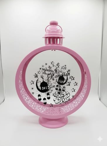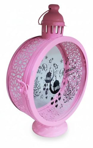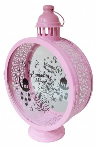 Generic - فانوس رمضانمعدن وزجاج مع شمعة ليد للمنزل خمات عاليه الجوده فانوس شموع عتيق للمنزل والمكتب مزخرف بكتابه رمضان كريم وصوره فانوس والديكور الداخلي والخارجي،بلون بينك