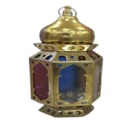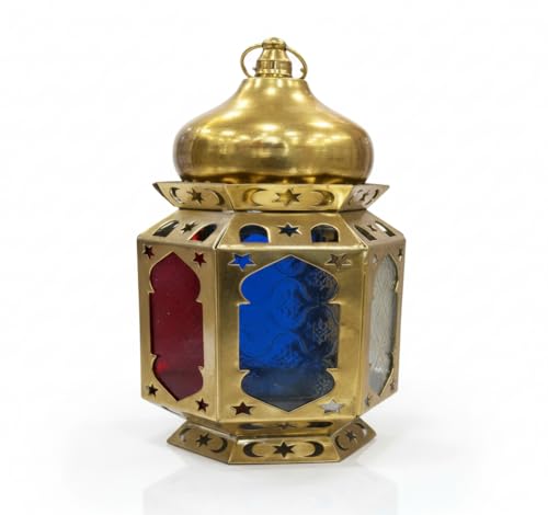 Generic - فانوس معدني مزخرف بنمط اسلامى على سداسى تصميم معلق لشهر رمضان،مع وحده اضائه بلون دهبى مع حلقه للتعليق وزجاج بلون احمر وازرق