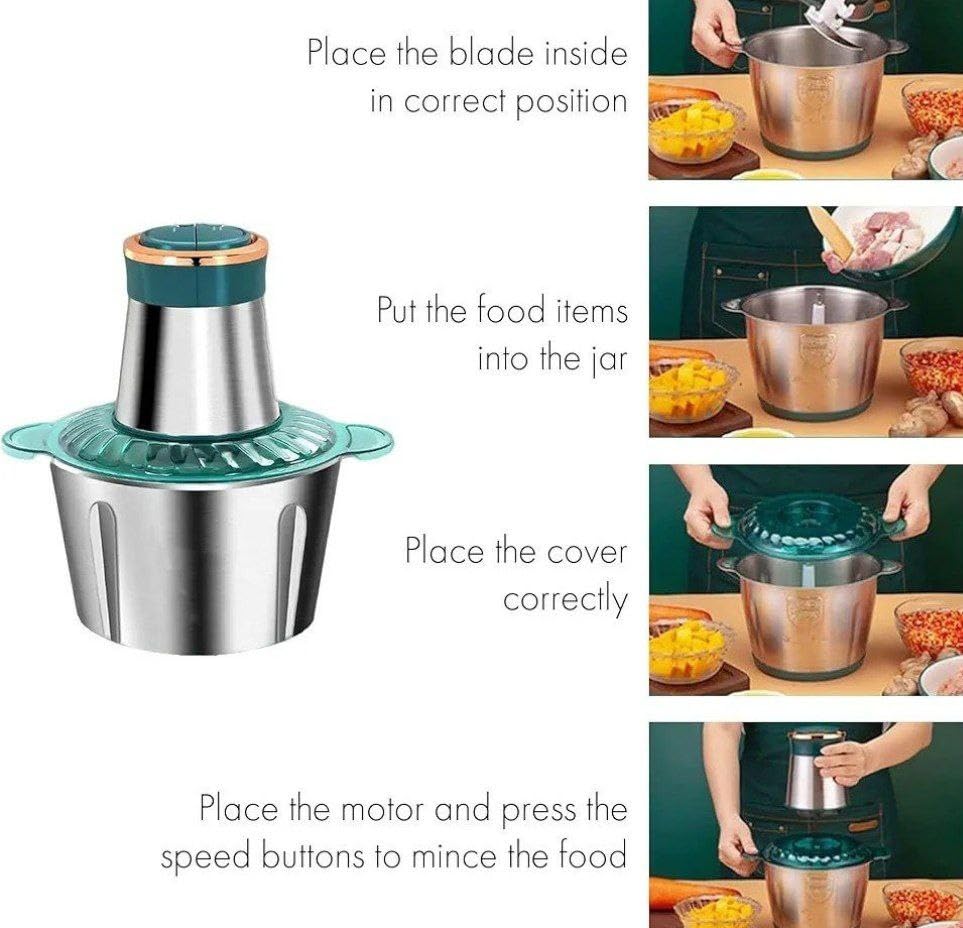 - محضر طعام كبه لفرم اللحوم والخضروات تصميم شيك وأنيق حله استانليس 304 مقاوم للصدأ القوه 300 وات 2 سرعه سعه 3 لتر سلاح رباعي استانليس سهلة التنظيف والاستخدام