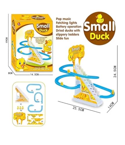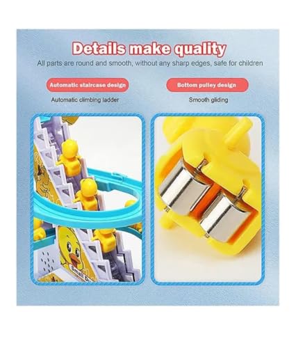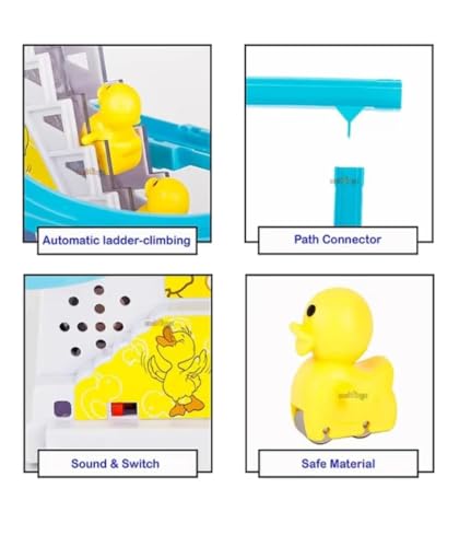 - ✨ تصميم مرح: مجموعة ألعاب البطة مزودة بإضاءة LED وامضة، تحتوي اللعبة على مسار صوتي ممتع وموسيقى مبهجة (مع زر تشغيل/إيقاف)، عند تشغيل اللعبة، ستصعد البطة السلالم مع الموسيقى، ثم تنزلق عبر الزحليقة.