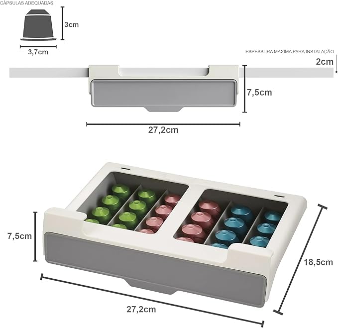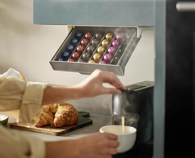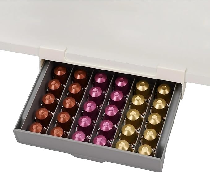 - تصميم موفر للمساحة: يعمل نظام التثبيت أسفل الخزانة على زيادة مساحة الطاولة مع توفير سهولة الوصول إلى كبسولات القهوة من خلال درج مريح قابل للسحب