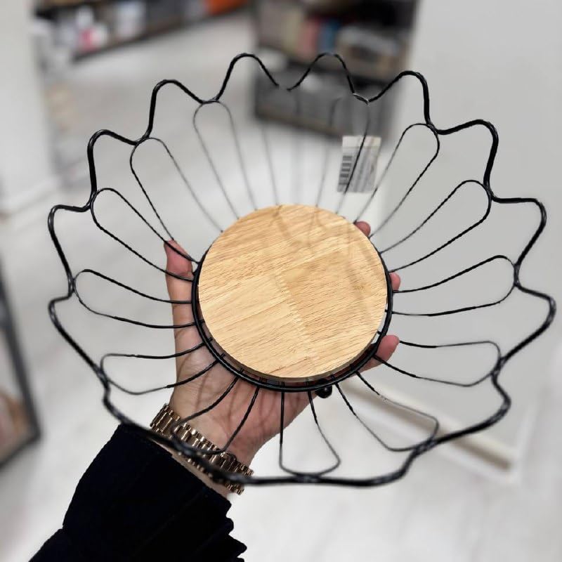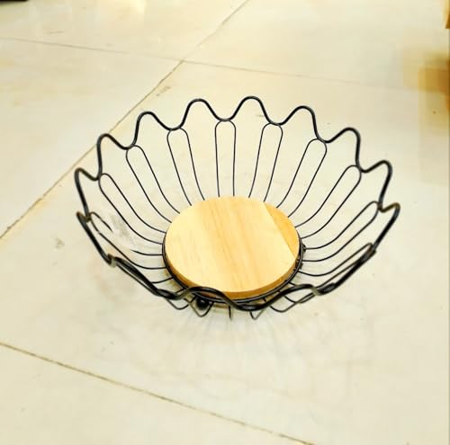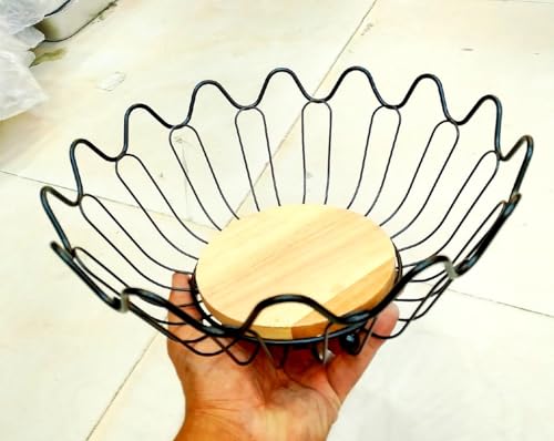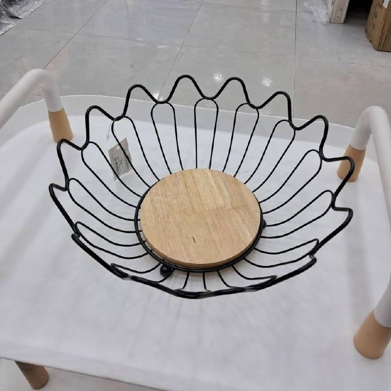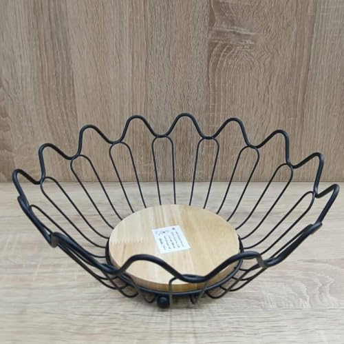 Generic - وعاء فاكهة سلكي مزخرف بقاعدة خشبية، معدن اسود، تصميم عصري