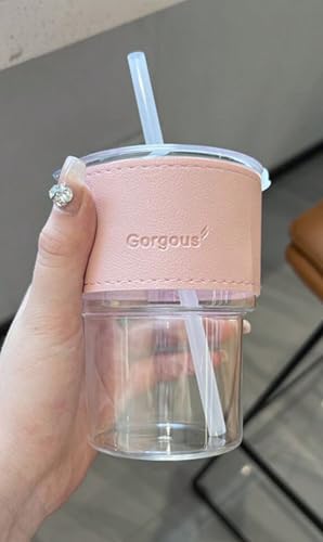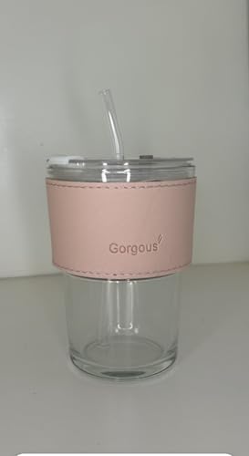 عام - كوب سفر من الزجاج بغطاء وشفاطة مع حافظة جلدية واقية ومضادة للانزلاق مناسب للمشروبات الساخنة والباردة والشاي والقهوة وعصائر السموذي والفواكه 1.0 ملم بلون وردي