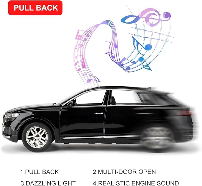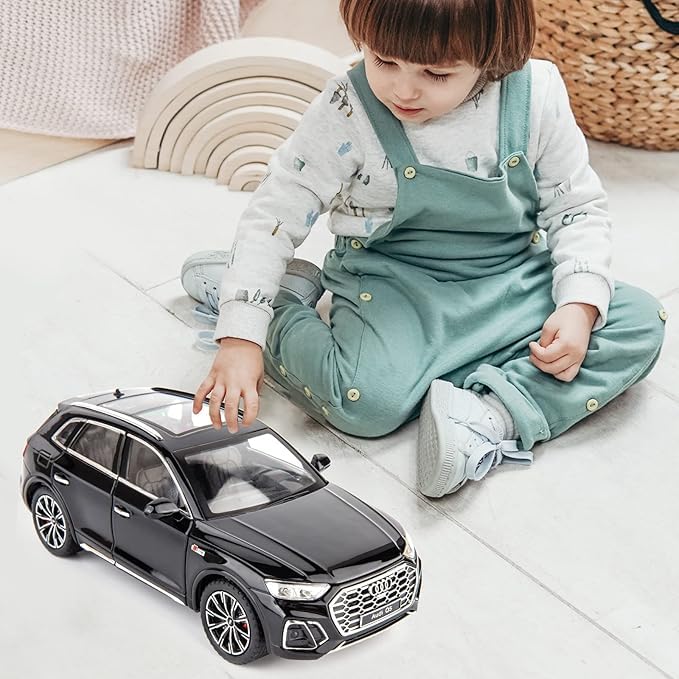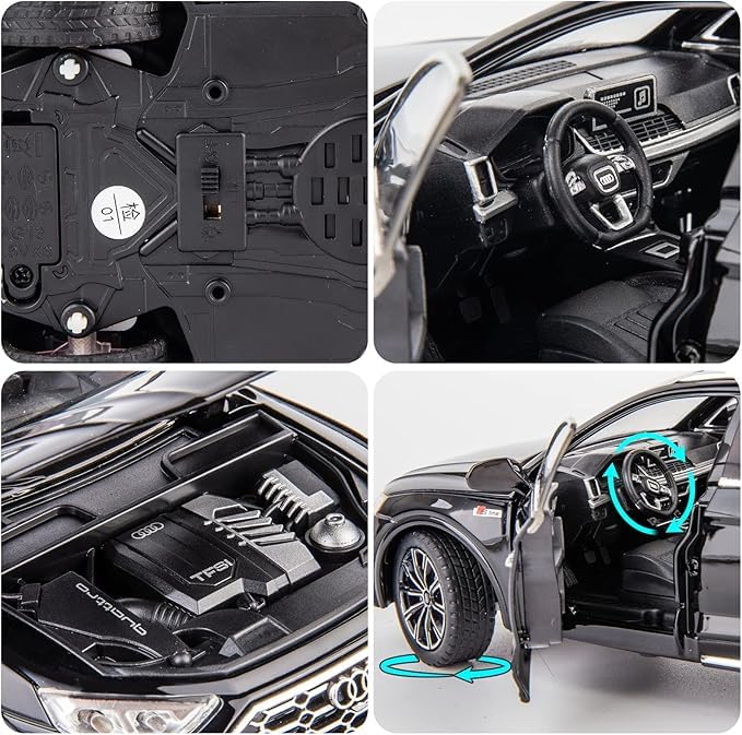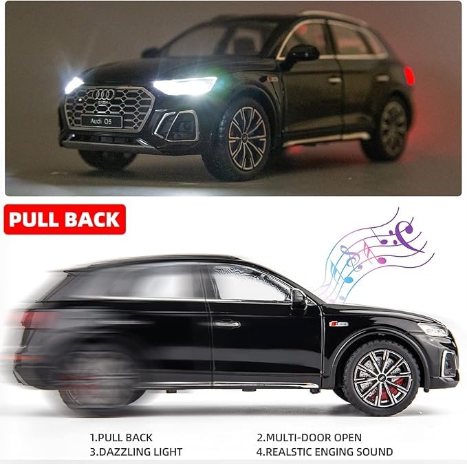 - لعبة سيارة اودي Q5 بدفع رباعي بمقياس 1/24 مصنوعة من خليط الزنك المعدني مزودة بالصوت والضوء للأطفال والبالغين (أسود)