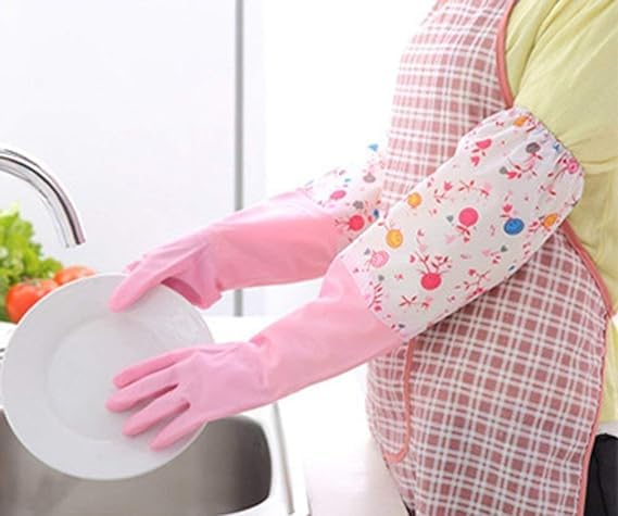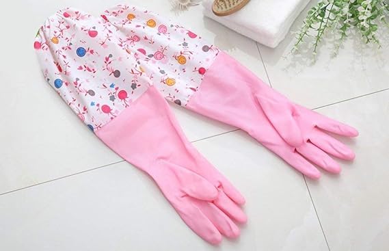 Generic - قفازات طويلة ببطانة مخملية من مطاط اللاتكس العازل المقاوم للماء للتنظيف المنزلي لغسيل الأطباق في الشتاء، وردي، زوج واحد