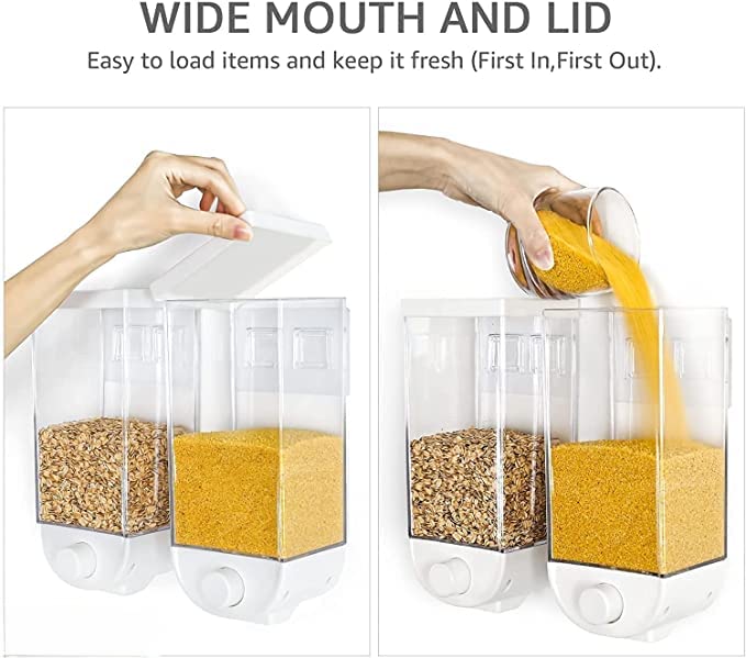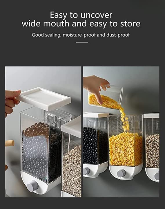 - تصميم سهل الاستخدام: امسح الجدار الأملس، وقم بإزالة غشاء الملصقات والصق الستيكر اللاصق على الحائط، واضغط لخروج الهواء واتركه قائما لمدة 24 ساعة. اضغط على زر موزع الحبوب لإخراج الطعام، والتحكم بحرية والحفاظ عليه طازجًا.