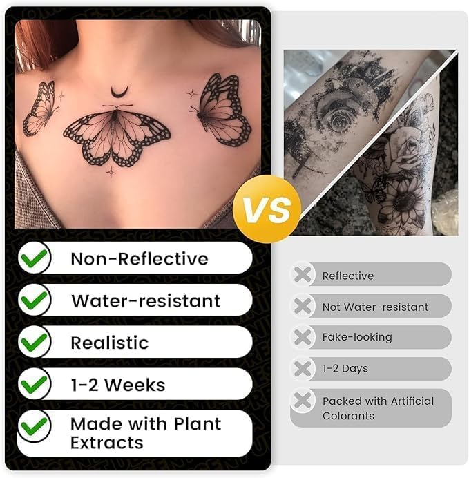 - 【سهل الاستخدام】ببساطة قم بقص تصميمك المفضل، وضعه على بشرتك، بلل الظهر بالماء، واضغط بقوة لمدة 10 ثوانٍ تقريبًا. في البداية، قد يبدو الوشم باهتًا، ولكن لا تقلق - سيصبح داكنًا تدريجيًا خلال الساعات القليلة القادمة للحصول على مظهر طبيعي مذهل.