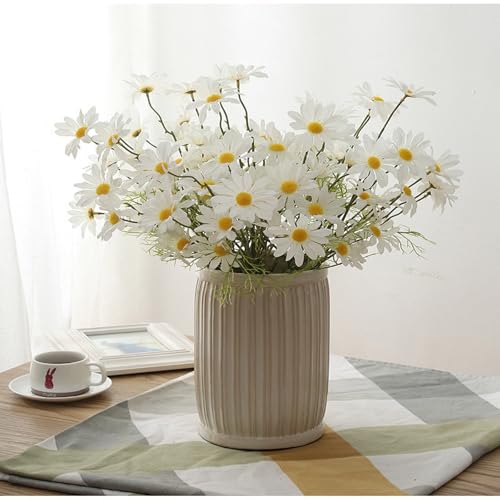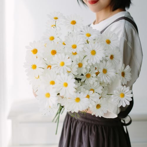 ZFanyun - 10 باقات بيضاء محاكاة زهرة الاقحوان البرية الاصطناعية في الهواء الطلق مع جذع شجيرة، ترتيب النباتات الخضراء الاصطناعية لحفلات الزفاف والمنزل والحديقة (10، ابيض)