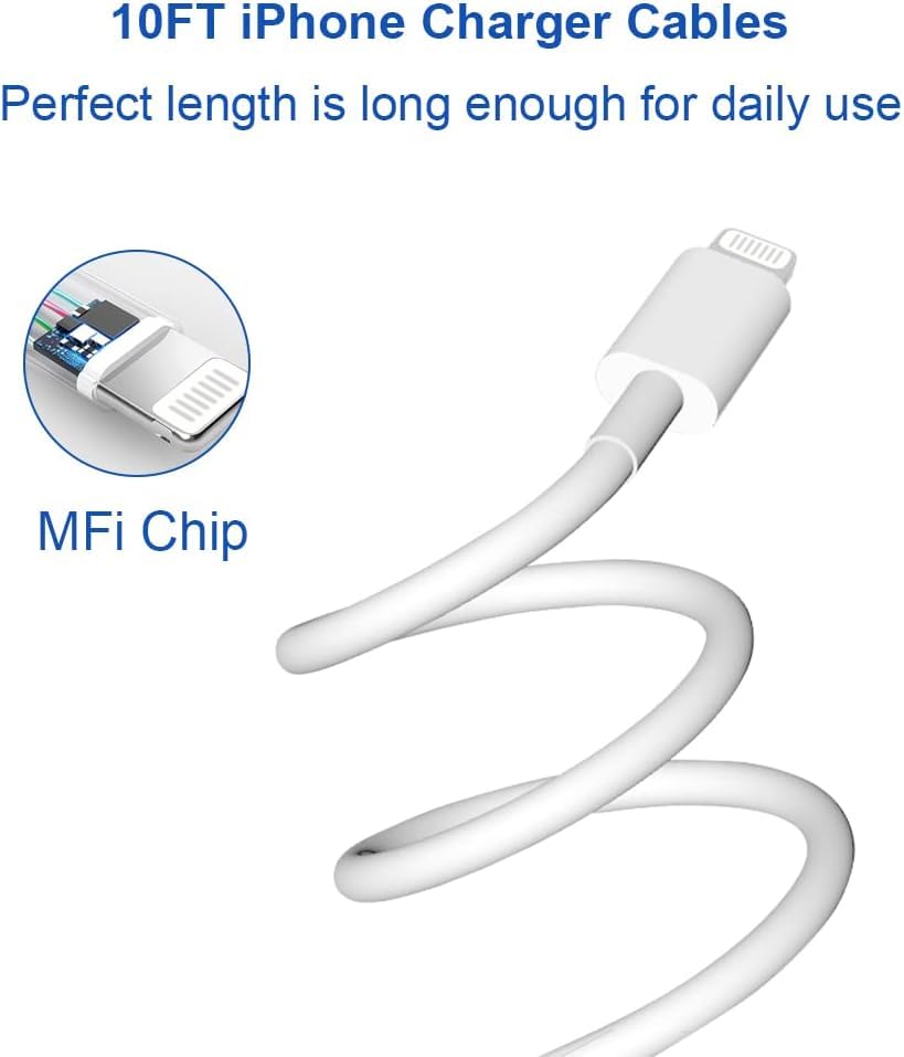 - [شاحن ايفون] كابلات الشحن السريع لجوال ايفون 14 13 12 11 بطول 10 قدم طويلة بما يكفي للسماح لك بشحن ايفون/ايباد من مسافة طويلة جدًا، مما يجعل حياتك أسهل وأكثر راحة. مع طول 10 أقدام، يمكنك الاستلقاء على الأريكة أو الأريكة واستخدام أجهزتك أثناء الشحن في نفس الوقت. ويمكنك استخدامها بحرية في غرفة نومك أو مكتبك أو في المقعد الخلفي لسيارتك. تضمن الكيبلات عالية الجودة المتانة والمرونة