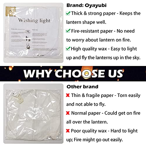 - 【لماذا تختارنا】معظم الفوانيس الطائرة من العلامات التجارية الأخرى لديها مشاكل في التمزق وعدم الطيران حتى. جميع فوانيس السماء الصينية اويايوبي مصنوعة باحترافية. بفضل الجودة المطورة والورق المتين المقاوم للحريق وخلية وقود الشمع المصنوعة خصيصًا، يمكن للفوانيس العائمة أن تطير حتى أكثر من 1200 متر. لا داعي للقلق بشأن اللهب لأنه إذا هبطت الفوانيس، فهذا يعني أن الشمع قد خرج.