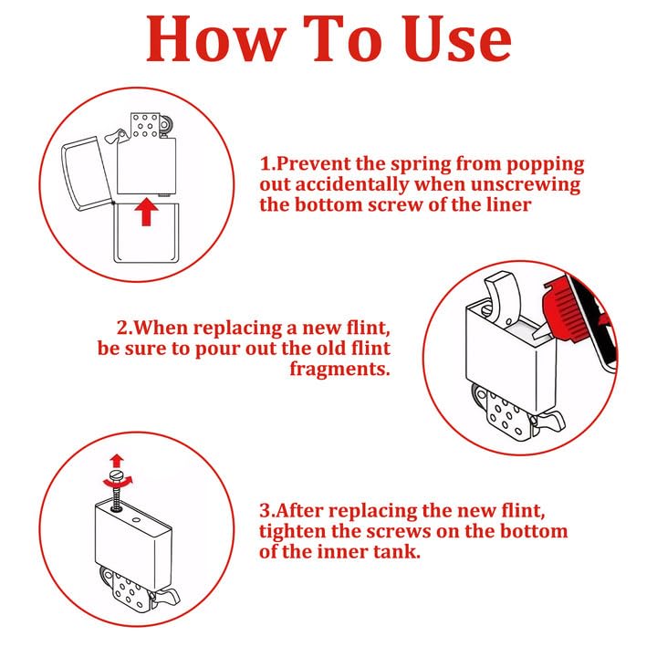 - تغيير الصوان: عند فك المسمار السفلي لشمعة الإشعال، امسك الزنبرك بيدك حتى لا يخرج عن طريق الخطأ ويسبب إزعاجًا. قبل إدخال الصوان الجديد، اسكب أجزاء الصوان القديمة. استخدم قوة معتدلة عند ضبط وضع فلينت المتوافق مع زيبو لتجنب الضغط المفرط وتلف عجلة الإشعال.
