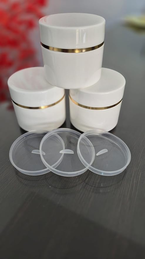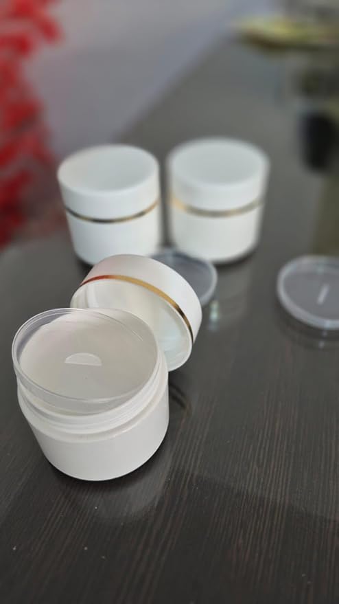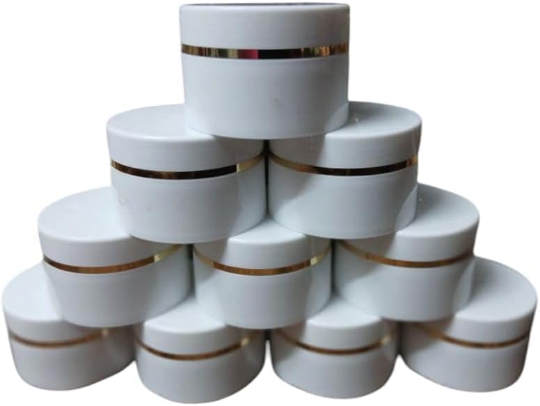 - مجموعة متكاملة: عبوة من 10 برطمانات بلاستيكية بيضاء بحافة ذهبية أنيقة، مثالية للاستخدامات التجميلية