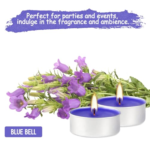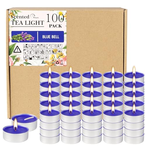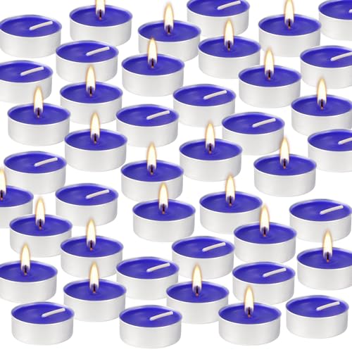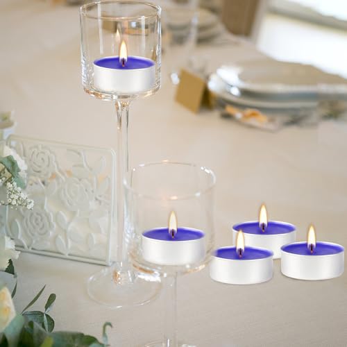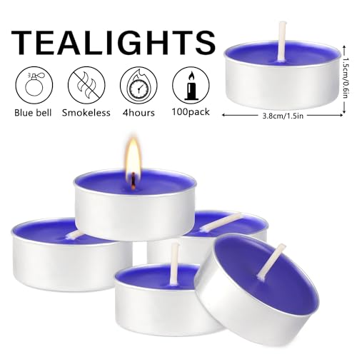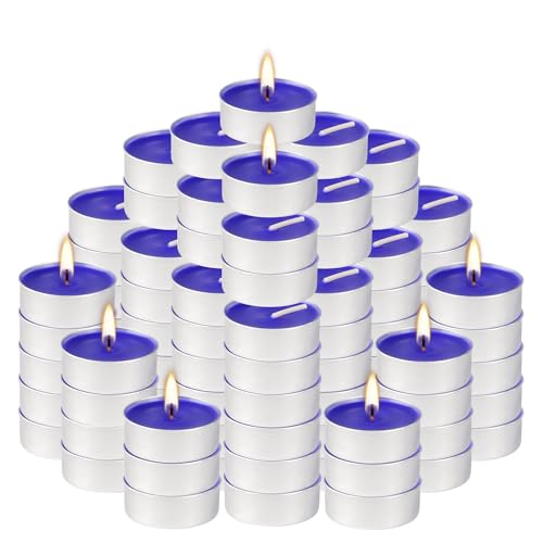 fclayvts - شموع صغيرة معطرة لمدة 4 ساعات، شموع بلو بيل للعلاج العطلي للمنزل وحفلات الزفاف والطوارئ (أزرق غامق، 100 قطعة)