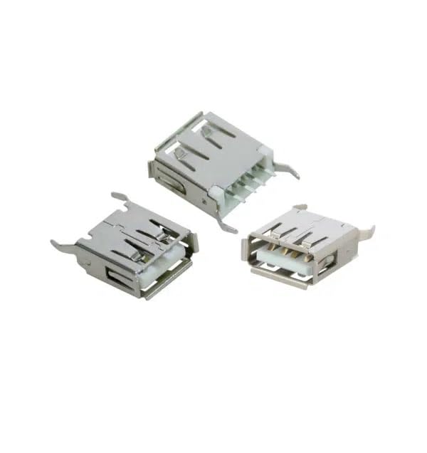 - موصل USB 2.0 نوع A بتركيب عمودي. تدعم واجهة USB 2.0 بمعدل نقل البيانات حتى 480 ميجابت/ثانية. عازل من بولي بيوتيلين تيرفثالات باللون الأبيض. التيار المقدر 1.5 أمبير. الجهد المقدر 30 فولت تيار متردد. أقصى مقاومة تلامس 20 مللي أوم. سبيكة نحاسية مطلية بالذهب في نقاط التلامس. هيكل من النحاس الأصفر المطلي بالنيكل. نطاق درجة حرارة التشغيل من -40° درجة مئوية إلى 105° درجات مئوية.