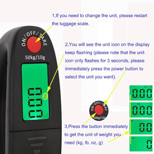 - السعة والدقة: يوفر ميزان وزن الأمتعة الرقمي المحمول سعة لا تقل عن 50 غرام/0.11 باوند وسعة قصوى 50 كجم/110 باوند. يوفر قياسات دقيقة بزيادات تدريجية تبلغ 10 غرام/0.03 باوند، مما يجعله مناسبًا لاحتياجات الوزن المختلفة.