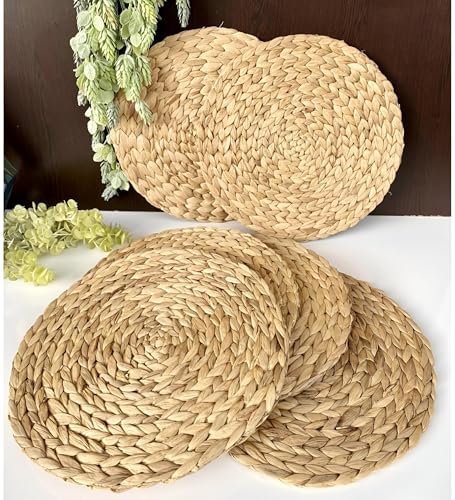 Generic - سجادات دائرية أنيقة مقاس 12 بوصة مصنوعة من الروطان الملتوي، إلى جانب قواعد أكواب من الياقوت المائي الطبيعي لطاولات الطعام، مما يوفر مقاومة للحرارة ووظيفة عدم الانزلاق لمنزلك (4 كوستر)