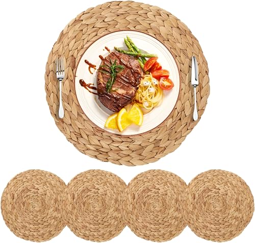 Generic - سجادات دائرية منسوجة مقاس 12 بوصة مصنوعة من الروطان الملتوي، تتميز بقواعد من الياقوت المائي الطبيعي لطاولات الطعام، مصممة لتكون مقاومة للحرارة وغير قابلة للانزلاق للاستخدام اليومي (4 كوستر)