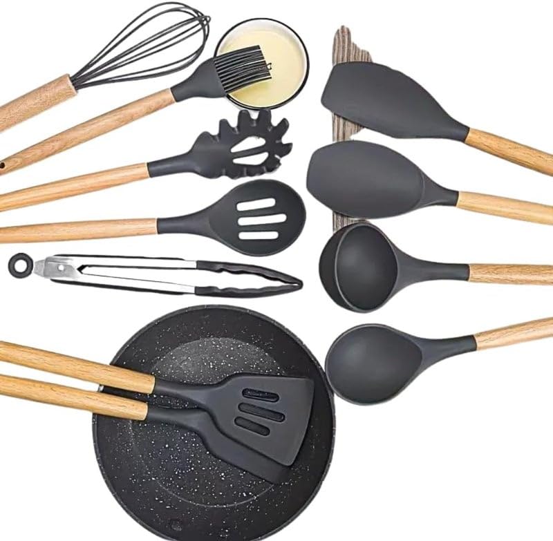 Generic - مجموعة ادوات طبخ سيليكون للمطبخ بمقبض خشبي، مجموعة ادوات طهي مقاومة للحرارة، اواني طهي غير لاصقة، امنة للاستخدام في غسالة الصحون، افضل ادوات مطبخ مع حامل، مجموعة ملاعق وملاقط وملعقة سباتولا من 12 قطعة