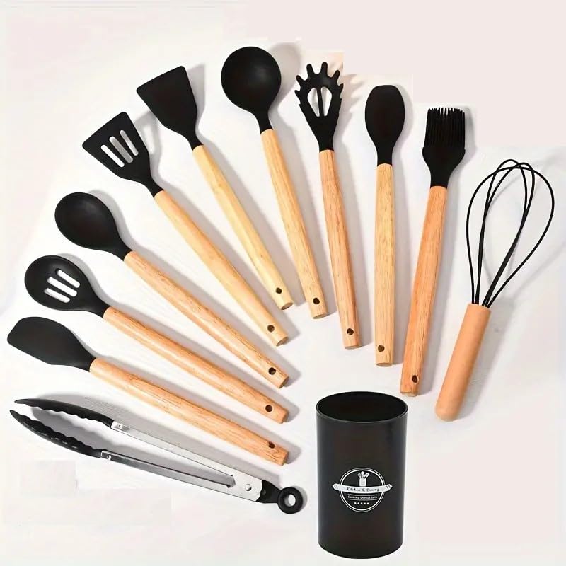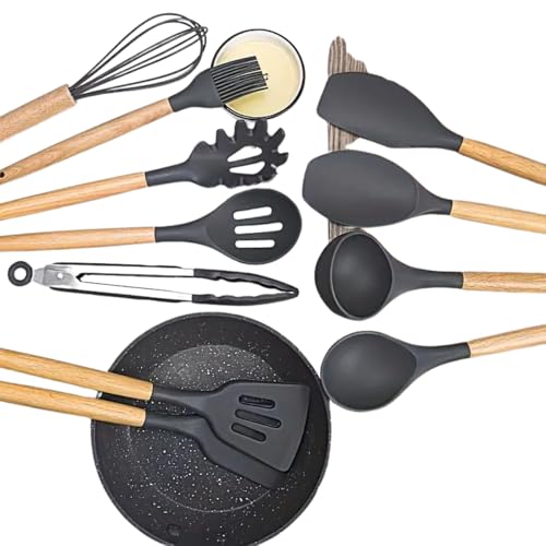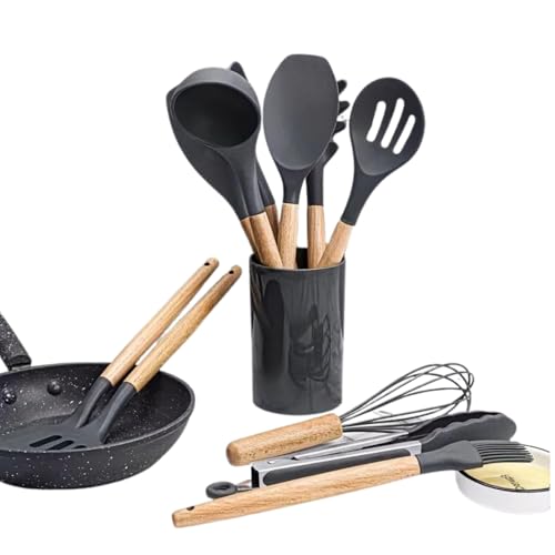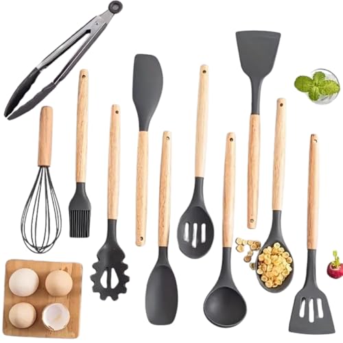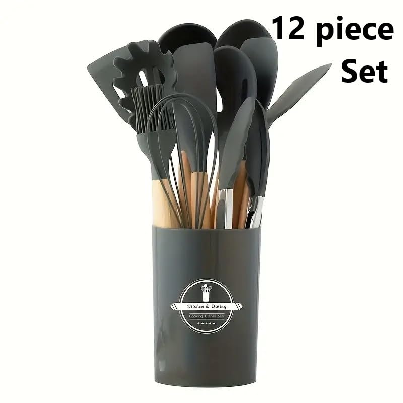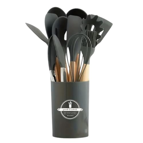 cosmetics beauty love - أدوات طبخ سيليكون للمطبخ بمقبض خشبي، مجموعة أواني طهي مقاومة للحرارة، غير لاصقة، آمنة للاستخدام في غسالة الصحون، أدوات مطبخ مع حامل، مجموعة ملاعق ومساكات وملعقة سباتولا من 12 قطعة (لون رمادي)