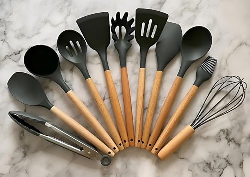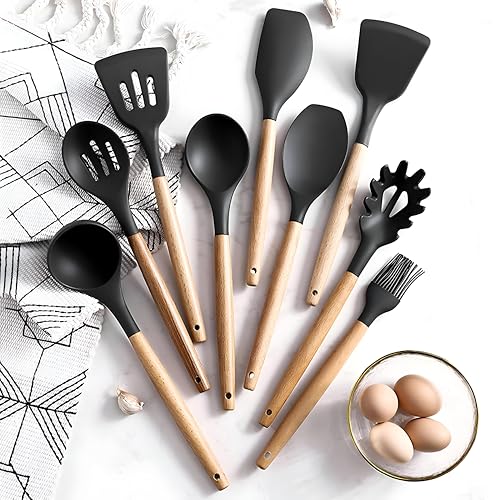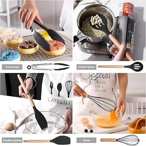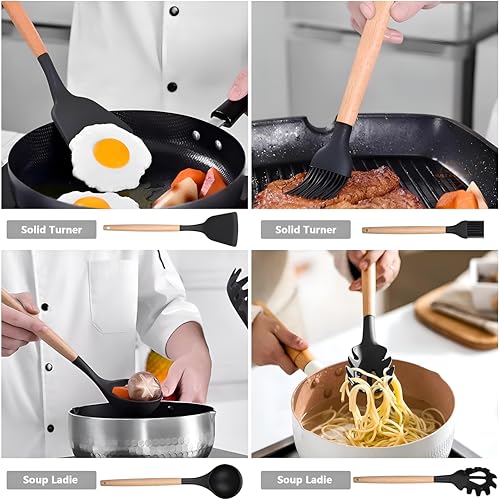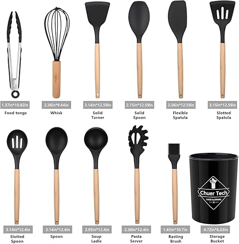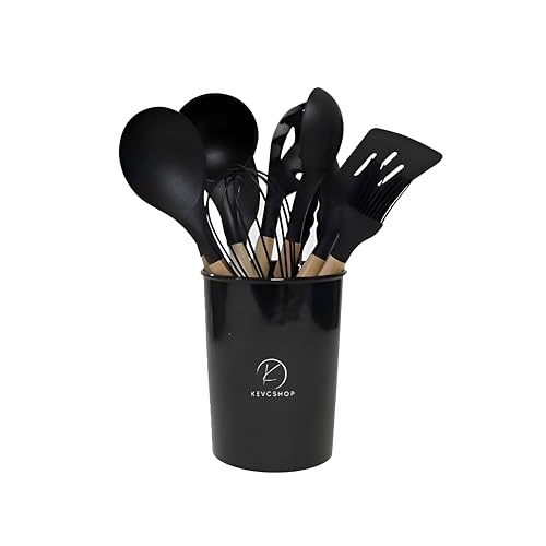 Generic - مجموعة أدوات مطبخ بمقبض خشبي مقاومة للخدش مع حاوية تخزين، ملاعق سباتولا خالية من البيسفينول أ ومعالق ومضرب وفرشاة ومغرفة للطبخ العصري من 12 قطعة بلون أسود