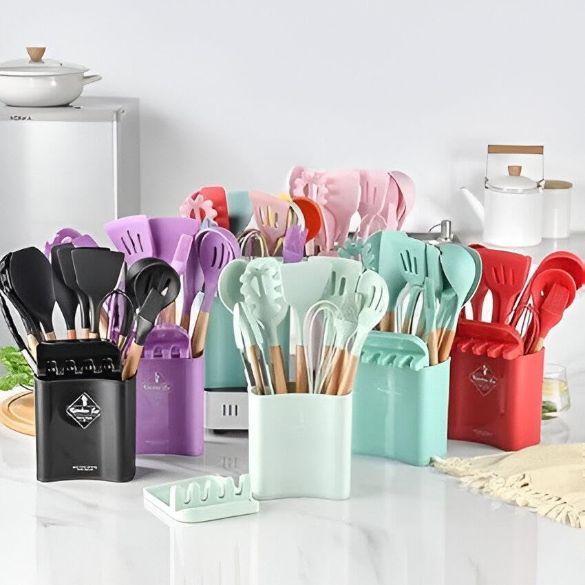 - تتضمن المجموعة ملعقة سيليكون، ومقلب، وملعقة، ومغرفة معكرونة، وفرشاة دهن، وخفَّاق، وملقط، ودلو تخزين، ومجموعة ملاعق سيليكون (ملعقة، وملعقة ضحلة، وملعقة مشقوقة)، مما يوفر تغطية شاملة لمهام الطبخ المختلفة.