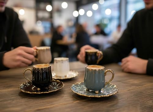 - 【مجموعة متناسقة من 12 قطعة】تتضمن هذه المجموعة 6 أكواب و6 أطباق مطابقة، مما يوفر تجربة تقديم قهوة منسقة ومنظمة تمامًا للقهوة العربية أو التركية أو الإسبريسو، مما يسمح للمستخدمين بالحفاظ على ترتيب طاولة جذاب وأنيق ومصقول، مما يضمن تقديم كل وجبة بطريقة أنيقة ومتناغمة واحترافية للتجمعات أو المتعة الشخصية.