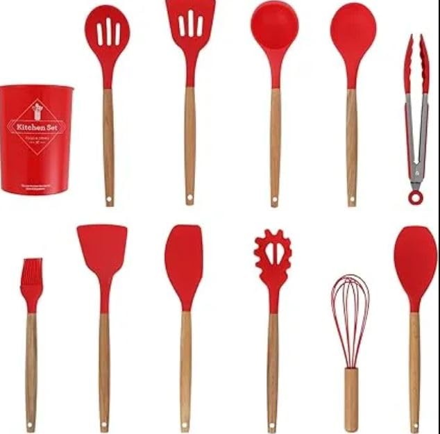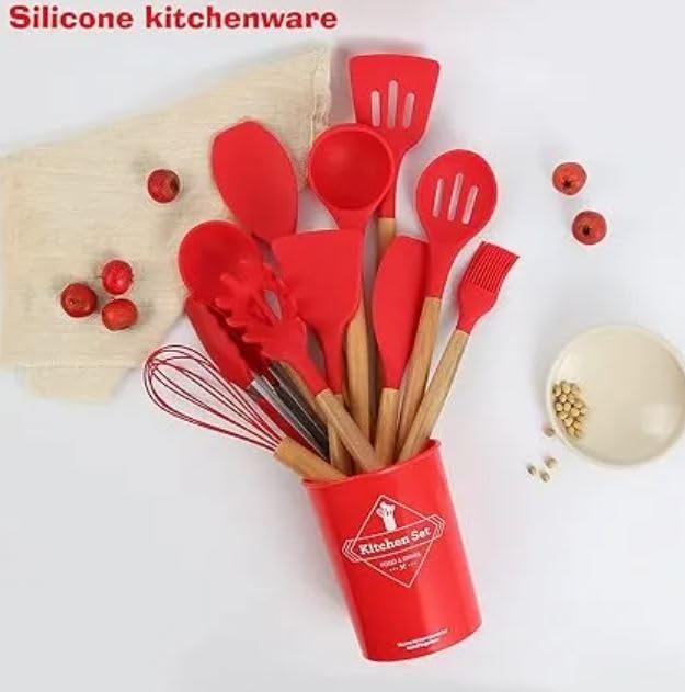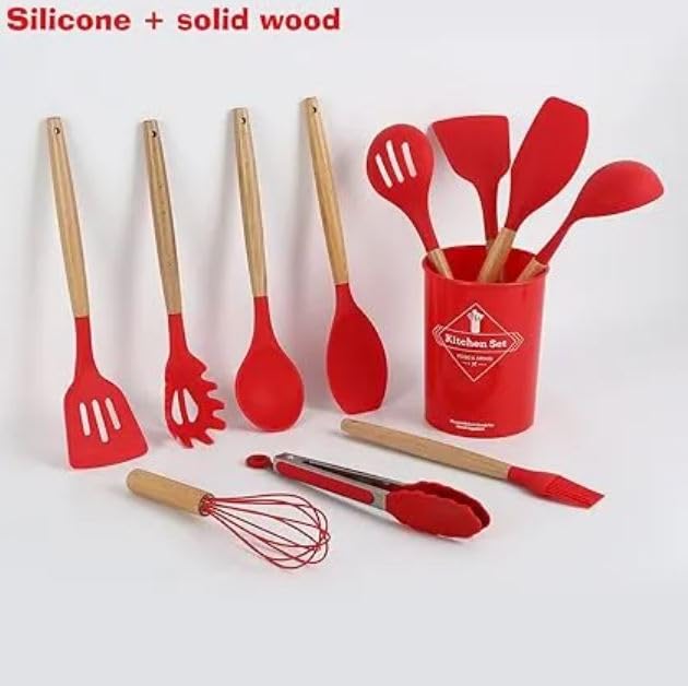 Generic - أدوات طهي مقاومة للحرارة بمقابض خشب غير لاصقة خالية من مادة بيسبفينول أ وغير قابلة للخدش ومتينة للخبز والقلي والخلط، مجموعة أدوات مطبخ مصنوعة من سيليكون أحمر، مكونة من 12 قطعة