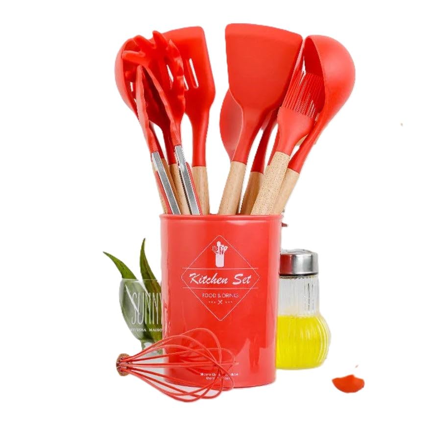 - مجموعة كاملة: تتضمن مجموعة أدوات المطبخ المصنوعة من السيليكون المكونة من 12 قطعة ملاعق وملاعق وخفاقة وأدوات طهي أساسية أخرى، وكلها مخزنة في حامل أدوات أحمر مطابق