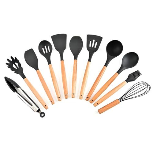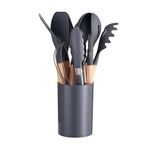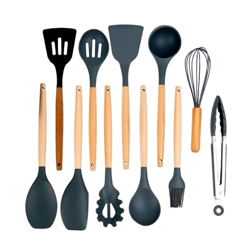 Generic - طقم مطبخ من السيليكون مكون من 12 قطعة - مقابض خشبية طبيعية مقاومة للحرارة - طقم مطبخ غير لاصق باللون الزهري. (رمادي)