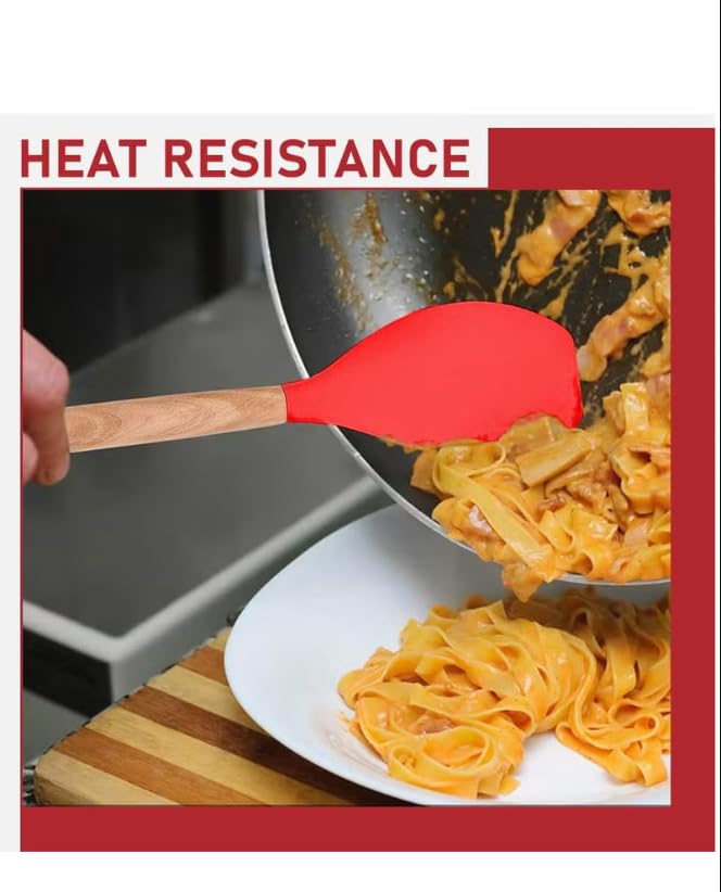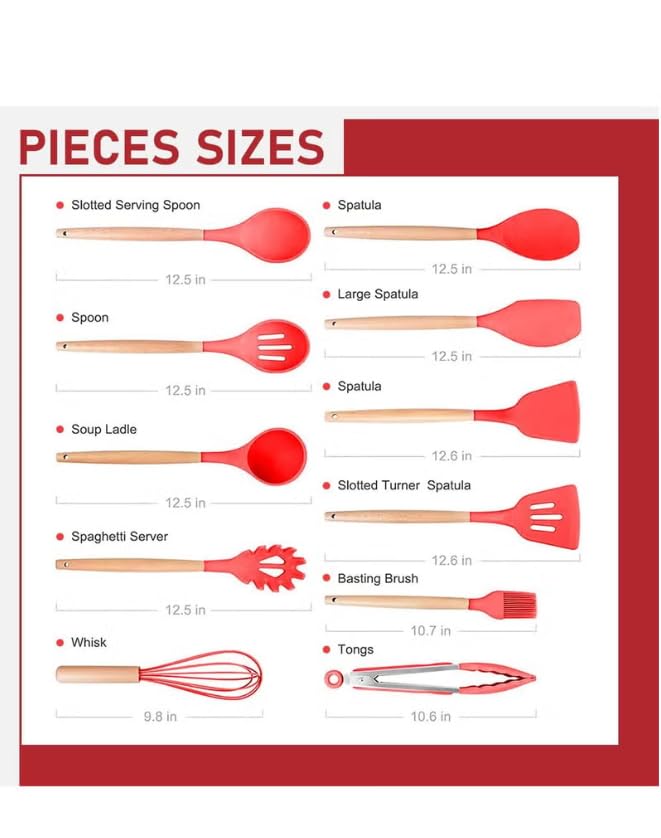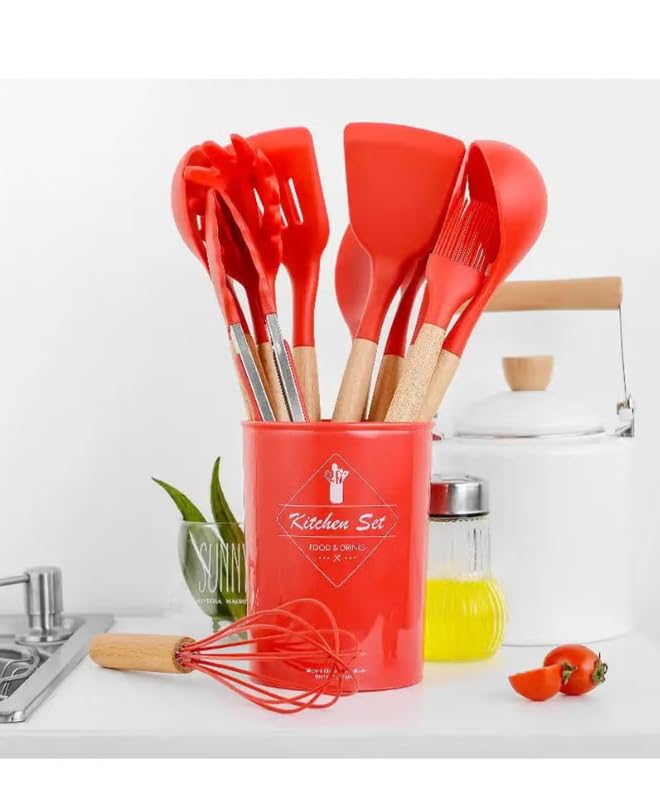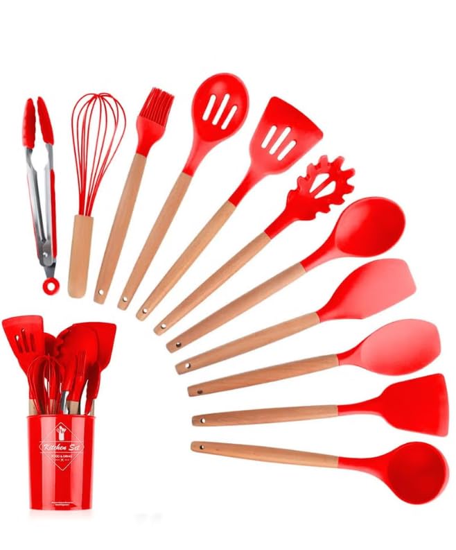 Generic - مجموعة أدوات مطبخ من السيليكون 12 قطعة بمقابض خشبية، أدوات طبخ بلون أحمر مع حامل