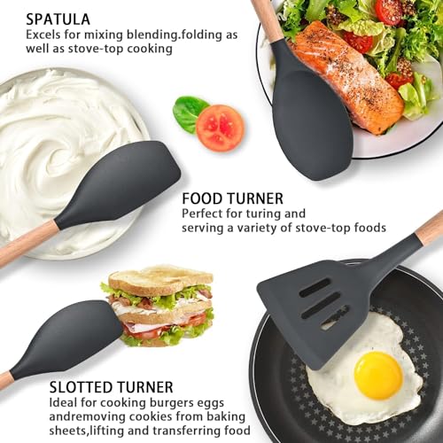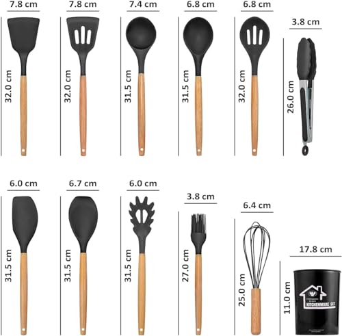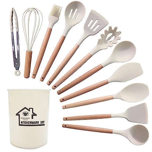 ULHYC - مجموعة أدوات مطبخ من السيليكون مكونة من 12 قطعة، أدوات طبخ من الستانلس ستيل مقاومة للحرارة، أدوات طبخ مع حامل للمقالي غير اللاصقة